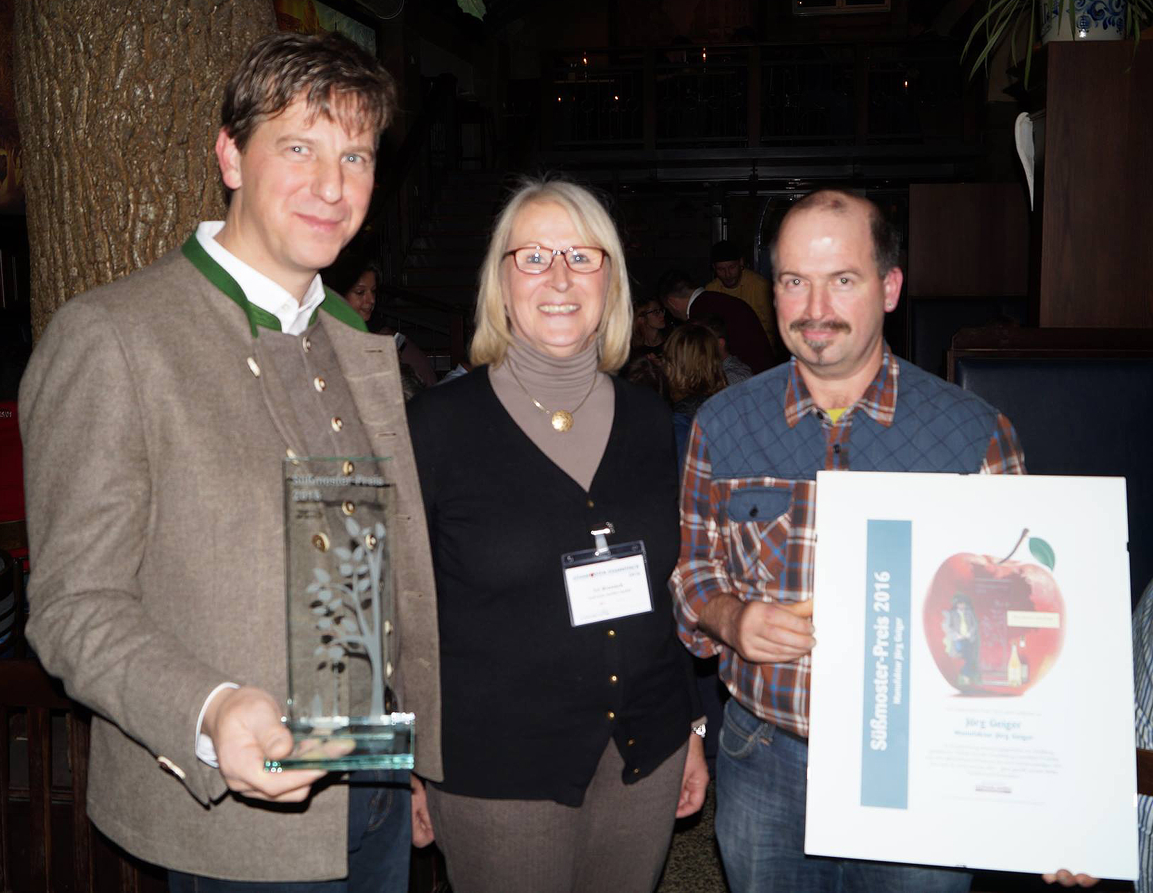 Die Preisverleihung fand am 07 November in Bayreuth statt im Rahmen des Süßmoster-Stammtisches 2016. Jörg Geiger, Inhaber der Manufaktur Jörg Geiger, nahm den Preis in Anwesenheit von ca. 100 Süßmoster-Kollegen entgegen. Der Süßmoster-Preis 2016 ehrt nicht nur die -Manufaktur, sondern den Unternehmer, der über Umwege seine Passion für das flüssige Obst entdeckt hat.. Was aber ist die besondere Geschichte des diesjährigen Preisträgers? Der 47-Jährige gelernte Koch hat aus seiner Leidenschaft für alte, zum Teil längst vergessene Apfel- und Birnensorten ein einträgliches Geschäftsfeld entwickelt. Eigentlich sollte er den elterlichen Gasthof Lamm in Schlat übernehmen. Doch dann kam es anders. Geboren in einer Region, die auf 300 Quadratkilometern die größte zusammenhängende Streuobstwiese der Welt bietet, und mit einer kleinen Hausbrennerei im Familienbesitz lag es nahe, die Gastronomie und die Getränkeherstellung zusammen zu bringen.